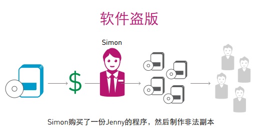 下圖顯示了一個(gè)簡(jiǎn)單的軟件盜版情境。某人購(gòu)買了一個(gè)許可證以使用你的某個(gè)軟件程序制作多個(gè)副本,然后進(jìn)行非法共享或銷售給他人。