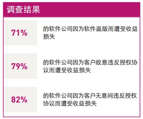 很明顯,軟件出版商的業(yè)務(wù)受到了影響,因?yàn)檫@些受訪者中有71%表示他們因?yàn)檐浖I版遭受了收益損失。此外,有79%表示他們因?yàn)榭蛻艄室膺`反授權(quán)協(xié)議而遭受收益損失。而82%的受訪者報(bào)告,還有因?yàn)榭蛻魺o(wú)意間違反授權(quán)協(xié)議而遭受的收益損失。