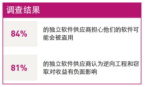 多數(shù)典型軟件公司或智能設(shè)備制造公司的市場(chǎng)價(jià)值。相應(yīng)地,由于公司在爭(zhēng)取業(yè)務(wù)方面變得更加積極,競(jìng)爭(zhēng)壓力也會(huì)自然增加。競(jìng)爭(zhēng)性的偵查活動(dòng)越來(lái)越普遍,而您寶貴的軟件知識(shí)產(chǎn)權(quán)(包含代碼、算法、應(yīng)用程序數(shù)據(jù)文件和商業(yè)機(jī)密)均處在窺探視線、逆向工程、竊取以及競(jìng)爭(zhēng)對(duì)手進(jìn)行偽造剽竊的風(fēng)險(xiǎn)之中。毫無(wú)疑問(wèn),逆向工程和竊取商業(yè)機(jī)密會(huì)對(duì)軟件出版商造成負(fù)面影響。在最近的一次調(diào)查中,全球獨(dú)立軟件開(kāi)發(fā)商受訪者中有壓倒性的84%報(bào)告稱他們擔(dān)心自己的軟件可能會(huì)被盜用。81%的人認(rèn)為逆向工程和竊取正在耗掉他們的收益。