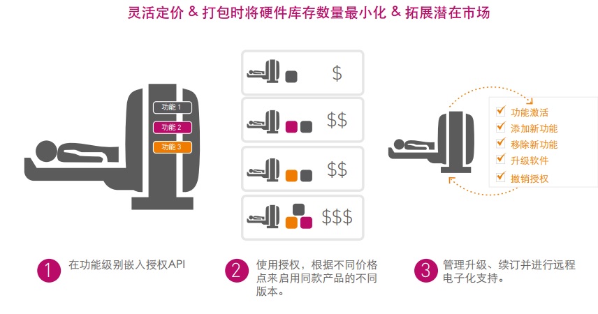 當(dāng)您將功能級(jí)授權(quán)以及打包能力搭建到硬件產(chǎn)品目錄中時(shí),即可真正提升單個(gè)硬件設(shè)備在大量多樣化市場(chǎng)中的總體可用性。停用或移除“基本”版本設(shè)備的高級(jí)功能意味著能以更低的價(jià)格提供該設(shè)備,從而贏得低端市場(chǎng)?;蛘撸O(shè)備供應(yīng)商也可以對(duì)一些為高端客戶或縫隙市場(chǎng)提供附加價(jià)值的高級(jí)功能收取額外費(fèi)用。有一點(diǎn)是確定無疑的,醫(yī)療設(shè)備供應(yīng)商若不具備將硬件及解決方案各項(xiàng)功能貨幣化的能力,其市場(chǎng)適用性或產(chǎn)品定價(jià)會(huì)受到極大限制,這也等同于喪失了收入機(jī)會(huì)。