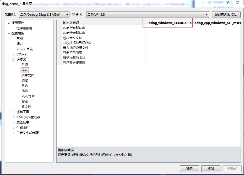 用記事本打開正式號(hào)密鑰文件xxxxx.hvc,把內(nèi)容全部復(fù)制,找到示例目錄中的vendor_code.h文件,把hvc文件中的內(nèi)容替換到“unsigned char vendorCode[] =”后面的引號(hào)中,然后點(diǎn)擊“項(xiàng)目”-“屬性”,在"Link"的輸入項(xiàng)中添加依賴庫libdog_windows_x64_xxxxx.lib,并把原來的依賴庫libdog_windows_x64_demo.lib刪除,然后重新編譯生成即可。注意這個(gè)libdog_windows_x64_xxxxx.lib庫應(yīng)拷貝至工程文件所設(shè)置的依賴庫目錄列表中。