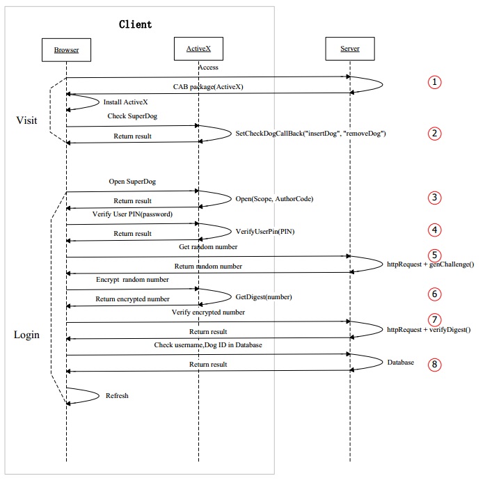 超級狗利用內(nèi)置算法采用查詢響應(yīng)的方式對訪問者身份進行驗證和確認。