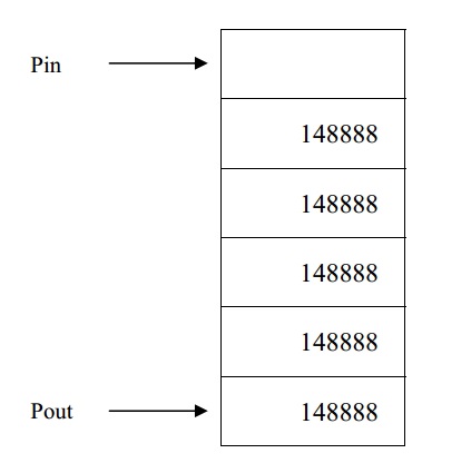 在上圖中,有一個初始化了的隊列,共有 6 個單元,初始數(shù)據(jù)為 148888,當發(fā)生的返回值不為 0 時,將 205429 賦給 Pin,并使隊列移動一個單元。在 Pout 處檢測被推出的數(shù)據(jù),當為 148888 時不做動作,當為 205429 時即認為非法。