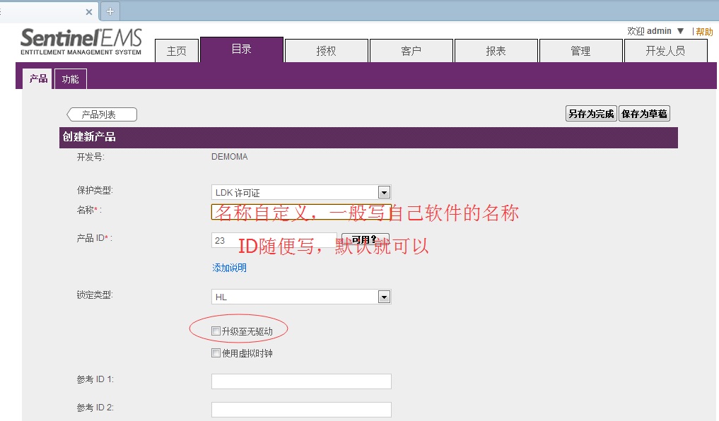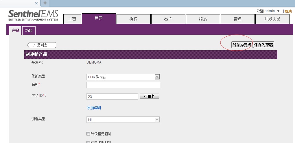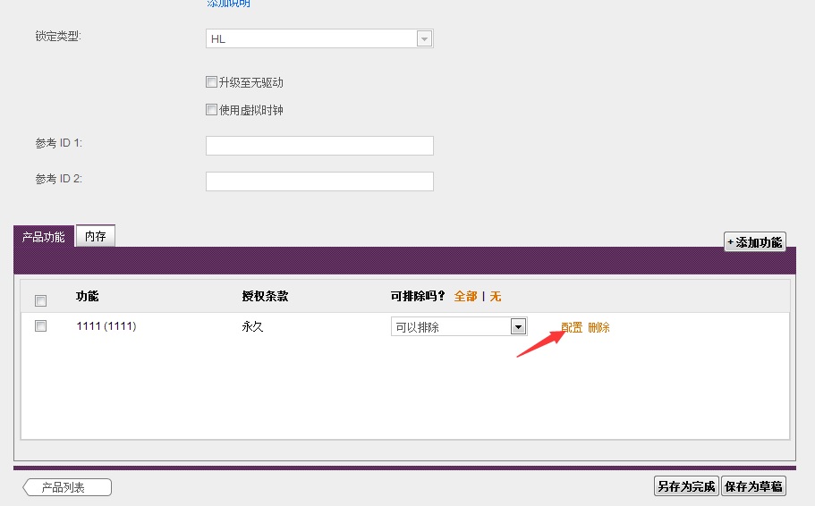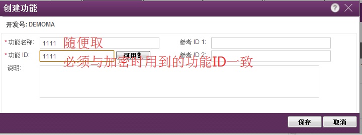 創(chuàng)建功能,這里的功能ID就是加密時選擇的feature ID,必須一致;功能名稱隨便取,一般與功能ID名字保持一致。填完以后點保存。