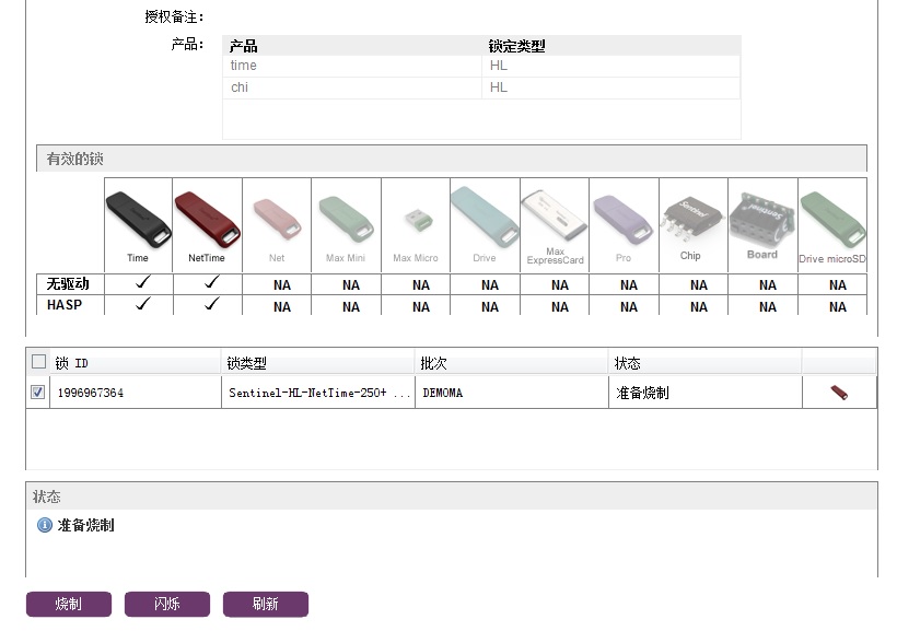 3、新建訂單、燒鎖-----設(shè)置好要燒鎖的數(shù)量、對應(yīng)的軟件產(chǎn)品,開始寫鎖。